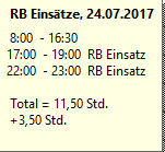 • 06:00 Planungscode "Komme Überstunde" --> Zeit von 06:00 bis Dienstbeginn (07:00) wird mit diesem Planungscode markiert