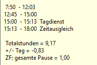 Dann entsteht bei dem oben genannten Beispiel folgende Kommt/Gehtzeiten: