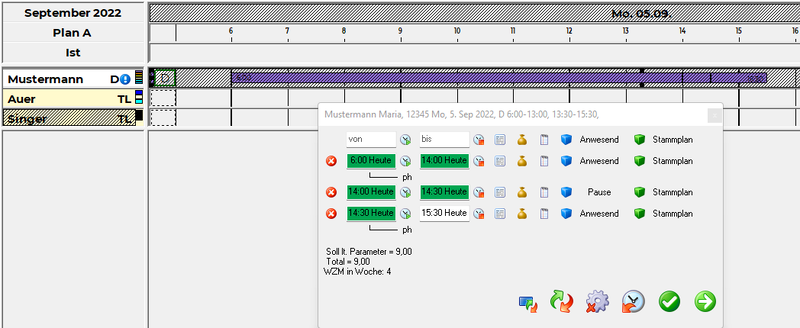 • Der Mitarbeiter wird bis 15:30 als geplant in der Besetzung und Tagesansicht angezeigt