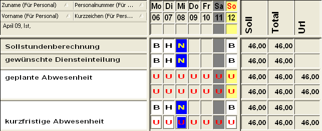Abwesenheiten werden in Form von "Planungscodes" verwaltet. Sie sind im Dienstplan links in der Legende sichtbar. Zur Abwesenheitsberechnung stehen folgende Abrechnungsarten zur Verfügung: