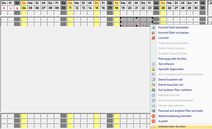 Um einen Urlaubsschein bzw. ein Antragsformular für eine andere Abwesenheit auszudrucken, wählt man Dienstplan die gesamte Dauer der Abwesenheit aus und macht einen Rechtsklick in diese Auswahl.