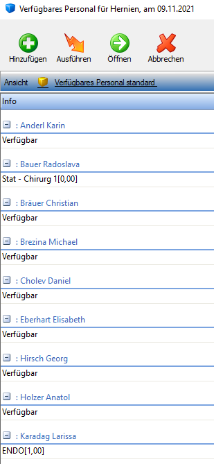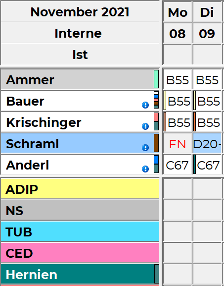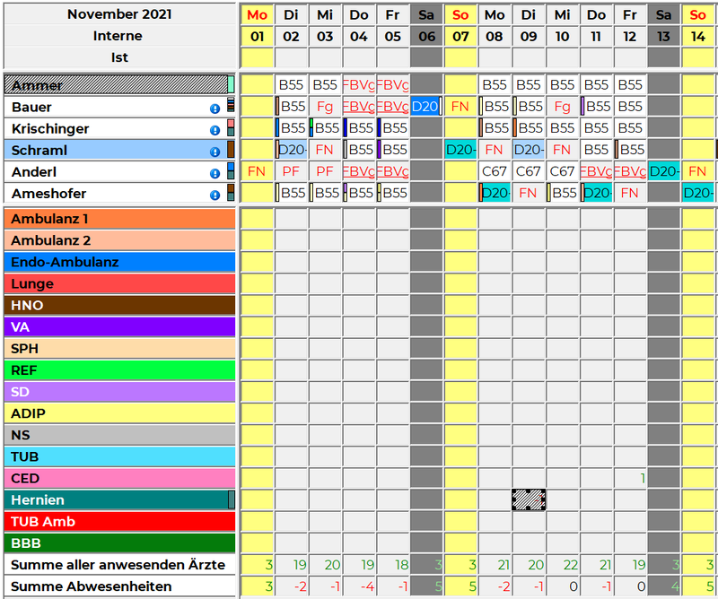 Im obigen Beispiel fehlt eine Person am 9.11. in der Hernien-Ambulanz, am 12.11. ist in der CED-Ambulanz eine Person mehr eingeteilt, als benötigt wird.