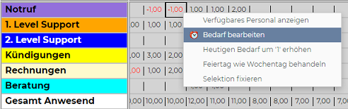 Ein Mitarbeiter mit der Aufgabe "1. Level Support" wird als Kandidat ausgewiesen und durch den Hinweis "1. Level Support +1" wird angezeigt, dass diese Aufgabe ohnehin mit 1 Person überbesetzt ist.