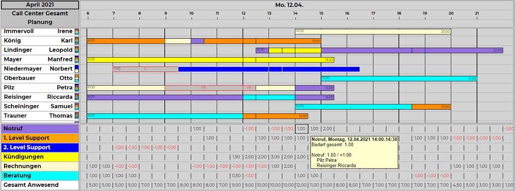 Im Tooltip werden pro Zeitbereich und Aufgabe die zugeteilten Mitarbeiter angezeigt.