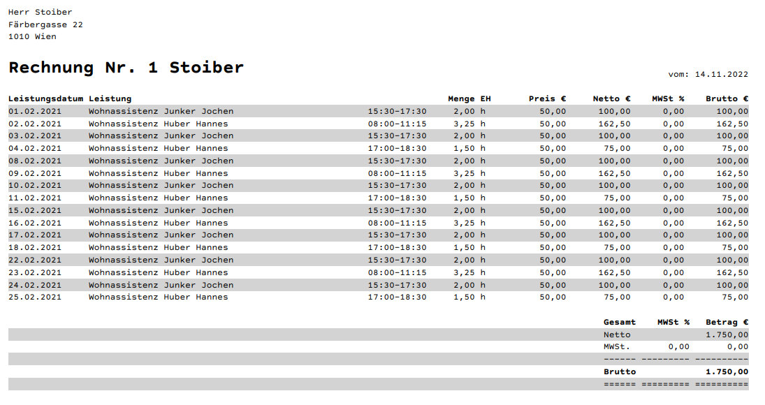 Bei Bedarf bietet Alex® die Möglichkeit, mit nur einem weiteren Knopfdruck eine Rechnung für jeden Klienten zu legen: