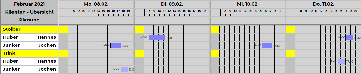 Betrachtet man den Dienstplan mit der Option "Tagesansicht", so sieht man schnell auf einen Blick, welcher Mitarbeiter zu welcher Zeit im Wohnbereich, in der Tagesstätte oder bei einem externen Klienten ist.