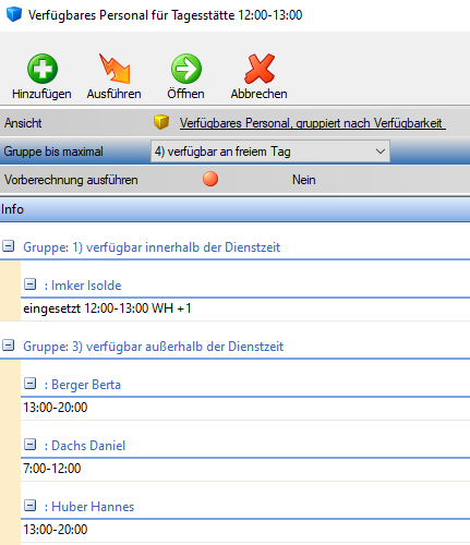 In der Gruppe 3 werden noch Berta Berger, Daniel Dachs und Hannes Huber als Vorschläge angezeigt, diese 3 Mitarbeiter haben alle zur gesuchten Zeit keinen Dienst eingetragen.