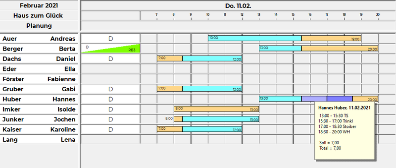 Bei Berta Berger ist ersichtlich, dass sie von 13:00 - 20:00 Uhr einen Dienst eingetragen hat.