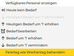 Grundsätzlich wird beim Hinterlegen eines Bedarfes dieser pro Tagesart definiert - d.h. ich muss auch für Feiertage definieren, wie der Bedarf ist.
