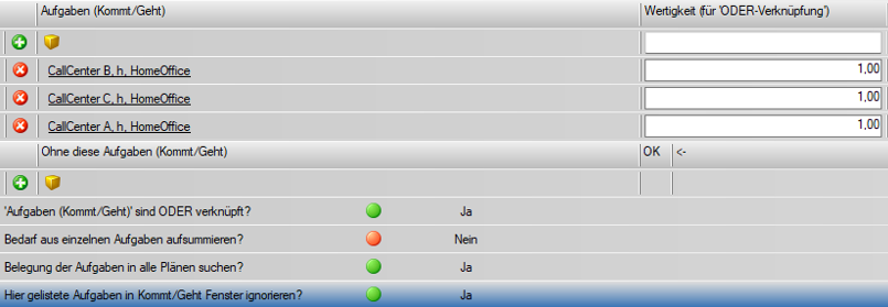 Soll der Filter als "ODER" Bedingung gelten, so muss der Parameter "'Aufgaben (Kommt/Geht)' sind ODER verknüpft?" gesetzt sein.