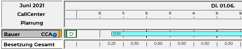 Mitarbeiter Bauer hat die Aufgabe "E-Maildienst", daher wird zu jeder Stunde die Besetzung mit 0,5 angezeigt.