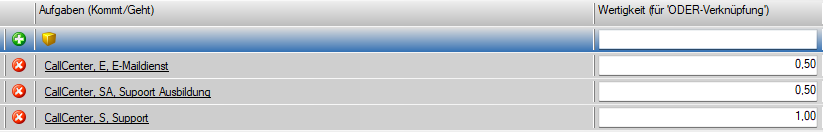 Diese Bedingung ist in sich eine ODER-Bedingung bzw. auch in Kombination mit Aufgaben (Kommt/Geht) Bei allen anderen Filtern wird dies als UND-Bedingung angesehen.