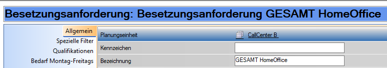 Die Besetzungsanforderung muss auf einer Planungseinheit (z.B. hier "CallCenter B") angelegt werden.