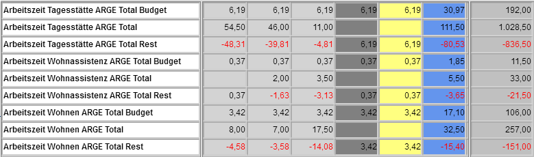 Anschließend erscheinen in der Besetzungsansicht drei neue Zeilen, die erste zeigt das Budget, die zweite summiert das ausgewählte Konto für die ausgewählten Berufsgruppen pro Tag und pro Monat, die dritte Zeile zeigt den Rest: