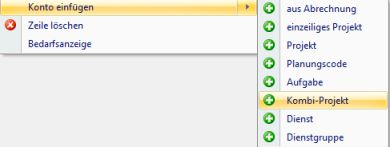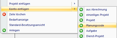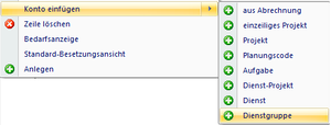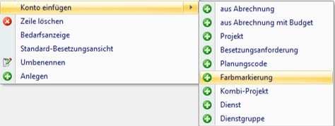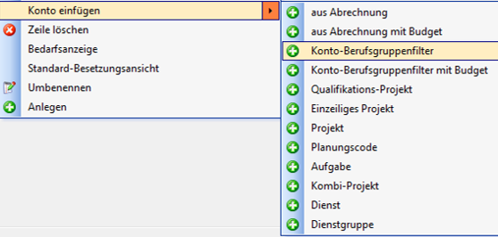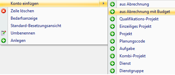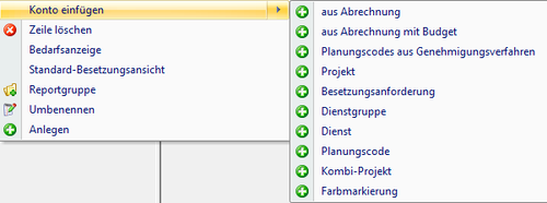 Mit einem Rechtsklick gelangt man in das Menü des Besetzungsreports. Hier gibt es die Kategorie "Konto einfügen". Darunter gibt es dann die verschiedenen Konto-Basis: