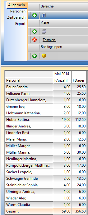 Alle anderen Einstellungen wie gewohnt für den Report treffen (Zeitbereich, Berufsgruppen, etc.) Anschließend erhalten Sie für die Mitarbeiter für den gewählten Zeitbereich die Anzahl und die Dauer des jeweiligen Dienstes.