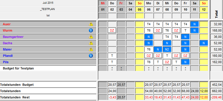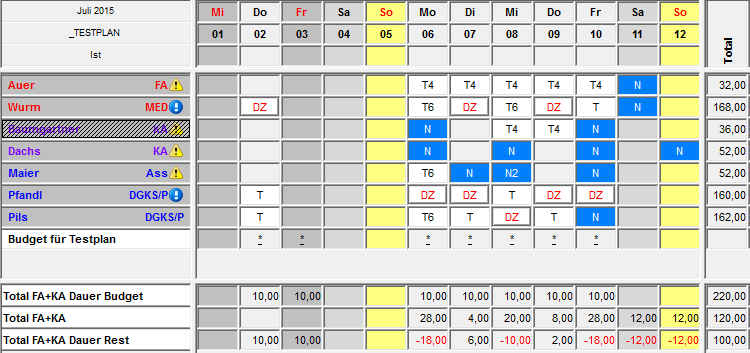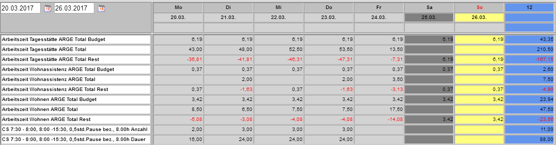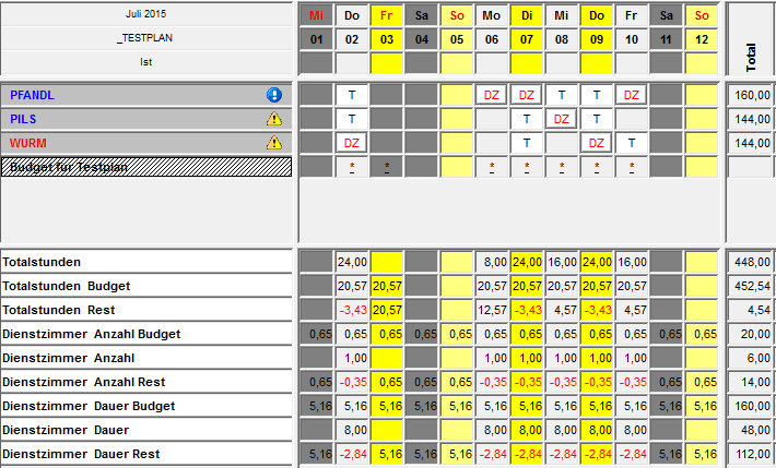 • Dauer Rest: Die Differenz zwischen dem hinterlegten Budget und den Eintragungen im Dienstplan