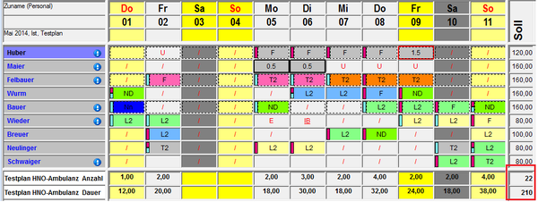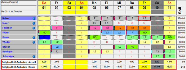 Jedes Zeitkonto aus der Abrechnung kann auch in der Besetzungsansicht angezeigt werden. Zusätzlich kann man für diese Summe auf Berufsgruppen einschränken, damit z.B. nur die Fachärzte und Assistenzärzte für diese Summen zählen, nicht aber der Primararzt und die Turnusärzte.