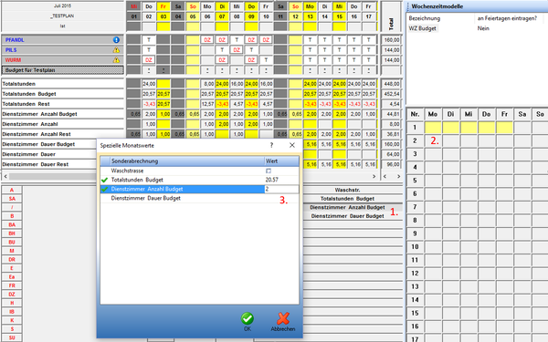 Legen Sie ein neues Wochenzeitmodell "Budget" an, danach kann mit den folgenden Schritten das Budget zugewiesen werden: 1. Klicken Sie die gewünschte Sonderabrechnung (im Beispiel "Dienstzimmer Anzahl Budget") an 2. Klicken Sie diese an den Tag im WZM, den Sie verändern möchten. 3. Es öffnet sich das Fenster "spezielle Monatswerte" - hier kann nun der gewünschte Wert eingetragen werden. -> Mit Ok bestätigen.