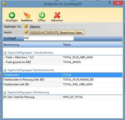 Hier öffnet sich nun das Suchfenster mit allen Zeitkonten, welche im System hinterlegt sind. Hier kann nach einem speziellen Zeitkonto gesucht werden: