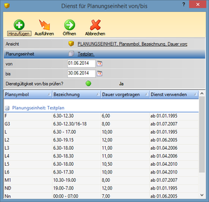 • Dauer: Die summierte Dauer der eingetragenen Planungscodes/Dienste/Aufgaben, etc.
