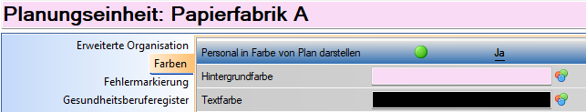 Sollen die Mitarbeiter in der Farbe der Planungseinheit dargestellt werden, so muss auf der Planungseinheit der Parameter "Personal in Farbe von Plan darstellen" gesetzt und eine Hintergrund- und Textfarbe hinterlegt sein.