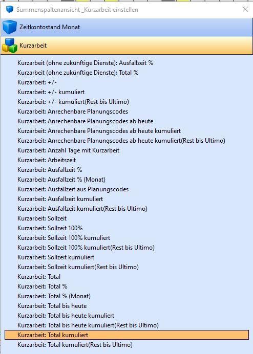 • beinhaltet nur die Zeiten aus Planungscodes, welche ins Konto "Kurzarbeit: Total" rechnen und im Parameter "anrechenbare Planungscodes" definiert wurden