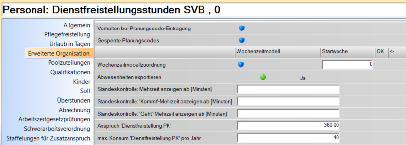 Im Reiter "Erweiterte Organisation" kann der Parameter "Anspruch 'Dienstfreistellung PK'" hinterlegt bzw. importiert werden.