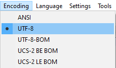 • Datei-Kodierung muss "UTF-8" sein (ohne "BOM"). Die Datei-Kodierung kann im Notepad++ wie folgt kontrolliert werden: