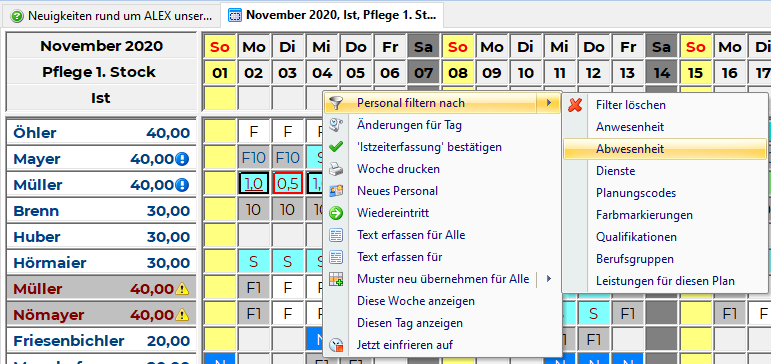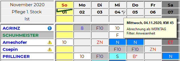 Mitarbeiter können im Dienstplan pro Tag oder auch für den gesamten Monat nach diversen Kategorien gefiltert werden. Je nach ausgewähltem Filter werden nur jene Mitarbeiter im Dienstplan angezeigt, die diesem Kriterium entsprechen.