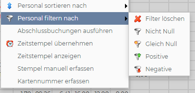 • "Nicht Null": Es werden nur Mitarbeiter angezeigt, deren Kontowert größer oder kleiner 0 ist. Mitarbeiter mit Kontowert genau 0 werden nicht angezeigt.
