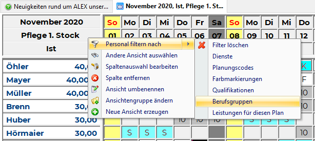 • Falls beispielsweise eine Filteroption "Berufsgruppe" bereits ausgewählt ist und eine andere Option "Planungscode / Urlaub" ausgewählt wird, kommt ausschließlich der zuletzt gewählte Filter zur Anwendung.