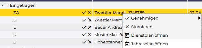 Im Genehmigungsfenster ist es möglich, direkt den Jahresplan des Mitarbeiters über das Kontextmenü zu öffnen.