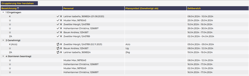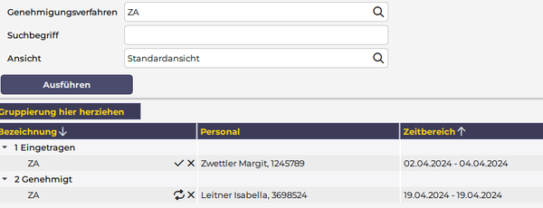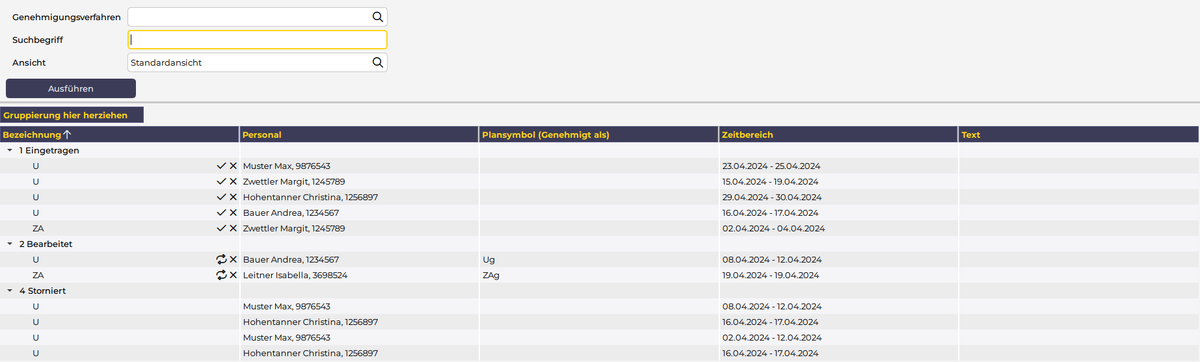 - Die Ansicht ermöglicht unter anderem die Suche nach einem bestimmten Personal, Filter nach Genehmigungsverfahren sowie die Definition individueller Ansichten.