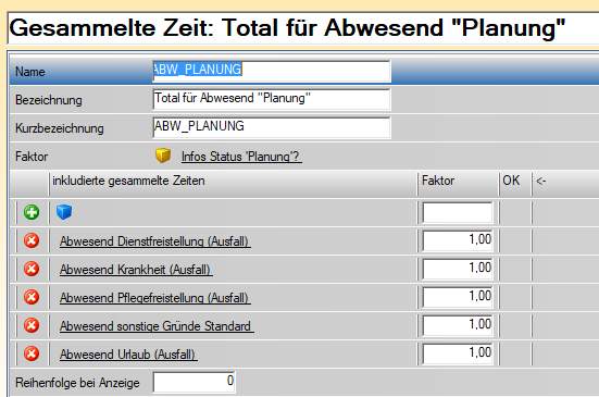 In diesem Beispiel wird als Faktor das Konto "Info Status Planung" hinterlegt. Dieses Konto ist im Status Planung mit "1" und im Status Ist mit "0" hinterlegt. Im Status Planung wird die gesammelte Zeit also mit "1" multipliziert. Im Status Ist wird die gesammelte Zeit mit "0" multipliziert --> diese gesammelte Zeit ist im Status Ist immer 0!
