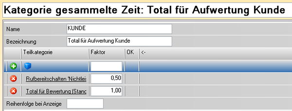 In diesem Fall, wird eine eigene "gesammelte Zeit" angelegt, in der das Standard "Total für Bewertung" 1x zur Gänze enthalten ist (Faktor = 1,00), die Rufbereitschaft-Nichtleistung jedoch nur zur Hälfte (Faktor = 0,50). Möchte man aus einem Standardschema bestimmte Stunden rausrechnen, kann zB auch der Faktor -1,00 verwendet werden.