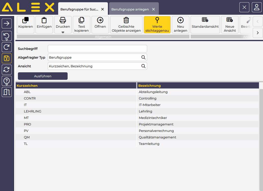 Berufsgruppen werden am einfachsten über den Navigatorpunkt "Berufsgruppe" bearbeitet bzw. neu angelegt.