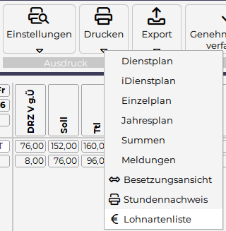 Nachdem der Dienstplan abgeschlossen wurde, kann die laut Abrechnungscheckliste definierte Lohnartenliste kontrolliert und an die Lohnverrechnung übergeben werden. Diese kann in der Werkzeugleiste im Untermenü des Punktes "Ausdruck" aufgerufen werden: