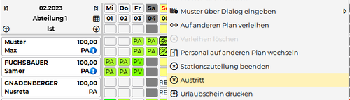 Der Austritt wird am einfachsten direkt im Dienstplan/Jahresplan eingegeben: