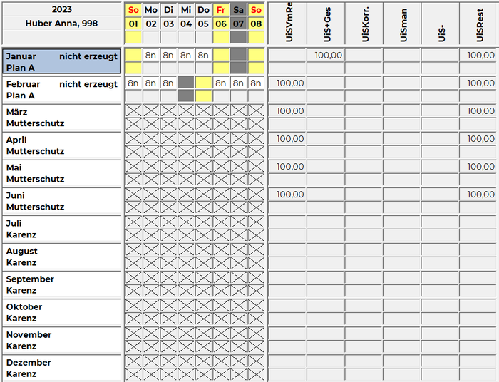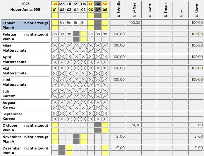 • Im Jahresplan wird an Stelle der Stammplanungseinheit die Inaktivzeit Mutterschutz oder Karenz angezeigt