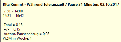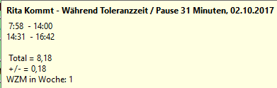07:58 - 14:00 = 5,97 (Alex zieht hier (während der Toleranzzeit) die Pause ab) 14:31 - 16:42 = 2,18 Gesamt = 8,15