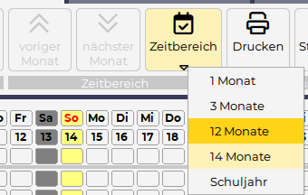 Hinweis: voriger/nächster Monat funktioniert nur wenn Zeitbereich 1 oder 3 Monate aktiviert ist und von Januar bis Dezember, danach muss mit der Schaltfläche "Vorherigen / Nächsten" öffnen gearbeitet werden, um das nächste Kalenderjahr zu öffnen.