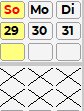 Bei Monaten mit 30 oder weniger Tagen werden die nicht existenten Tage mit einem schwarzen X dargestellt (z.B. 29., 30. und 31. im Februar).