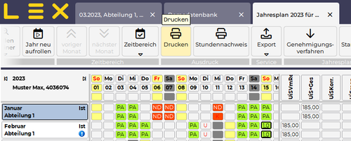 Um den Jahresplan für einen einzelnen Mitarbeiter zu drucken, muss der Jahresplan wie oben beschrieben geöffnet werden.