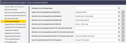 Die Summenspaltenansicht, welche standardmäßig im Jahresplan für alle Benutzer angezeigt wird, kann in den Stammdaten des Systems/Bereichs/Planungseinheit etc. unter "Summenansichten" hinterlegt werden.