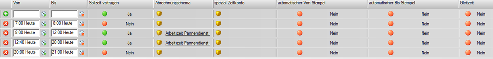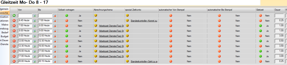 Wird jedoch eine Gleitzeitregelung angewendet, so muss beim Dienst definiert werden, welche Zeit Kernzeit und welche Gleitzeit ist (falls der Button Gleitzeit noch nicht sichtbar ist: Gleitzeit freischalten). Eine Zeit mit Schema, "Sollzeit Vortragen" und Gleitzeit = "NEIN" gilt als Kernzeit: