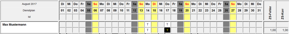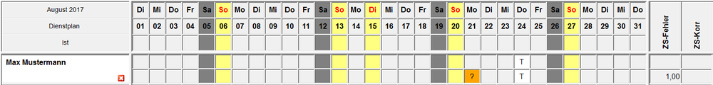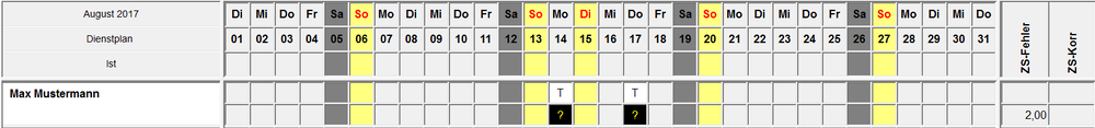 Hat der Mitarbeiter eine Kommt/Geht Stempelung an einem Tag ohne hinterlegten Dienst, gilt dies als fehlerhafte Zeitstempelung und wird im entsprechenden Konto angezeigt.