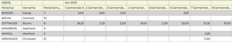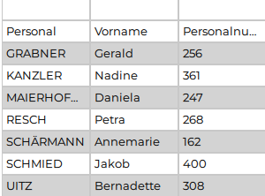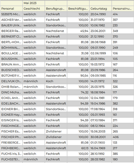 Hier zum Beispiel eine Auswertung von Geschlecht, Beschäftigungsausmaß in Prozent, Berufsgruppe und Personalnummer.