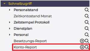 Bereits angelegte Konto-Reports können über den Navigator unter dem Punkt Konto-Report mit einem Klick auf die Lupe angezeigt werden: