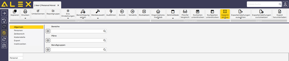 Die unten erläuterten Einstellungsmöglichkeiten werden von Alex® je Benutzer gemerkt, wenn man also den gleichen Report das nächste Mal öffnet, sind z. B. Bereich/Pläne/Berufsgruppen/Personal ... bereits ausgewählt.